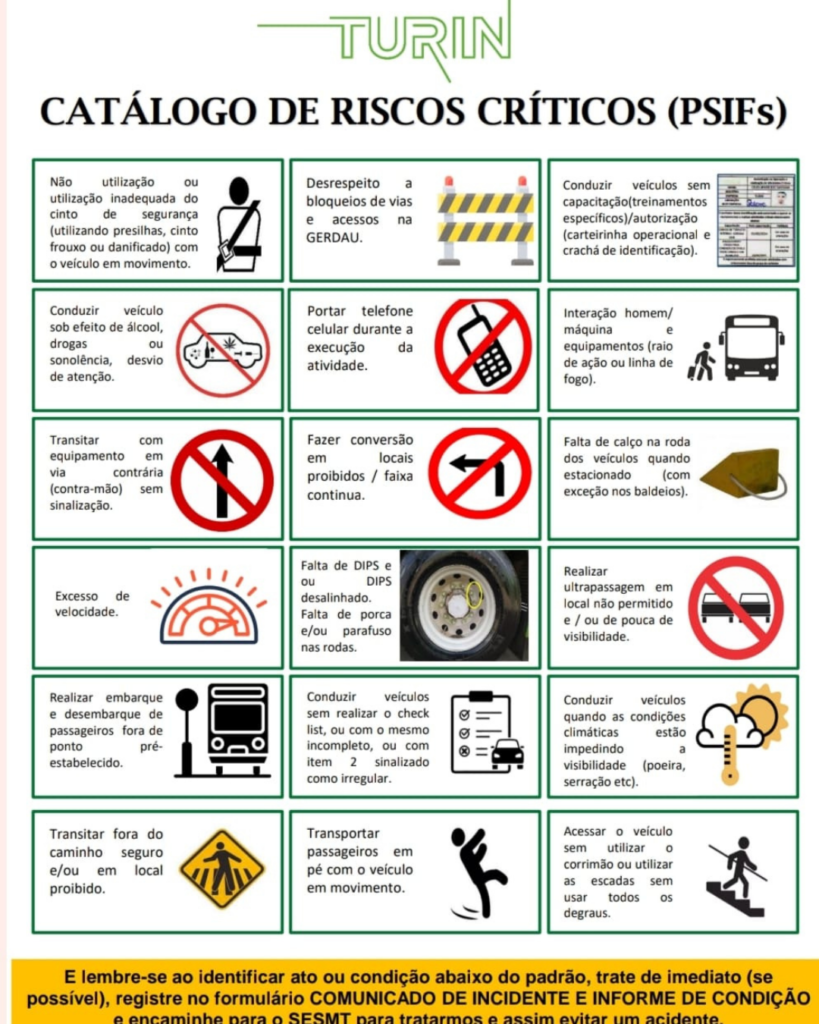 Com o objetivo de fortalecer ainda mais a cultura de segurança e prevenção, a Turin divulgou nesta semana, na unidade de Ouro Branco, o seu novo Catálogo de Risco. O material orienta as equipes sobre condições e atos inseguros que podem ser identificados no dia a dia e registrados como PSFIs e/ou Recusas.